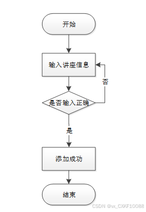 添加讲座信息功能,输入讲座名称、讲座类型、讲座简介等信息,并校验输入是否正确,讲座信息添加流程图,如图所示: