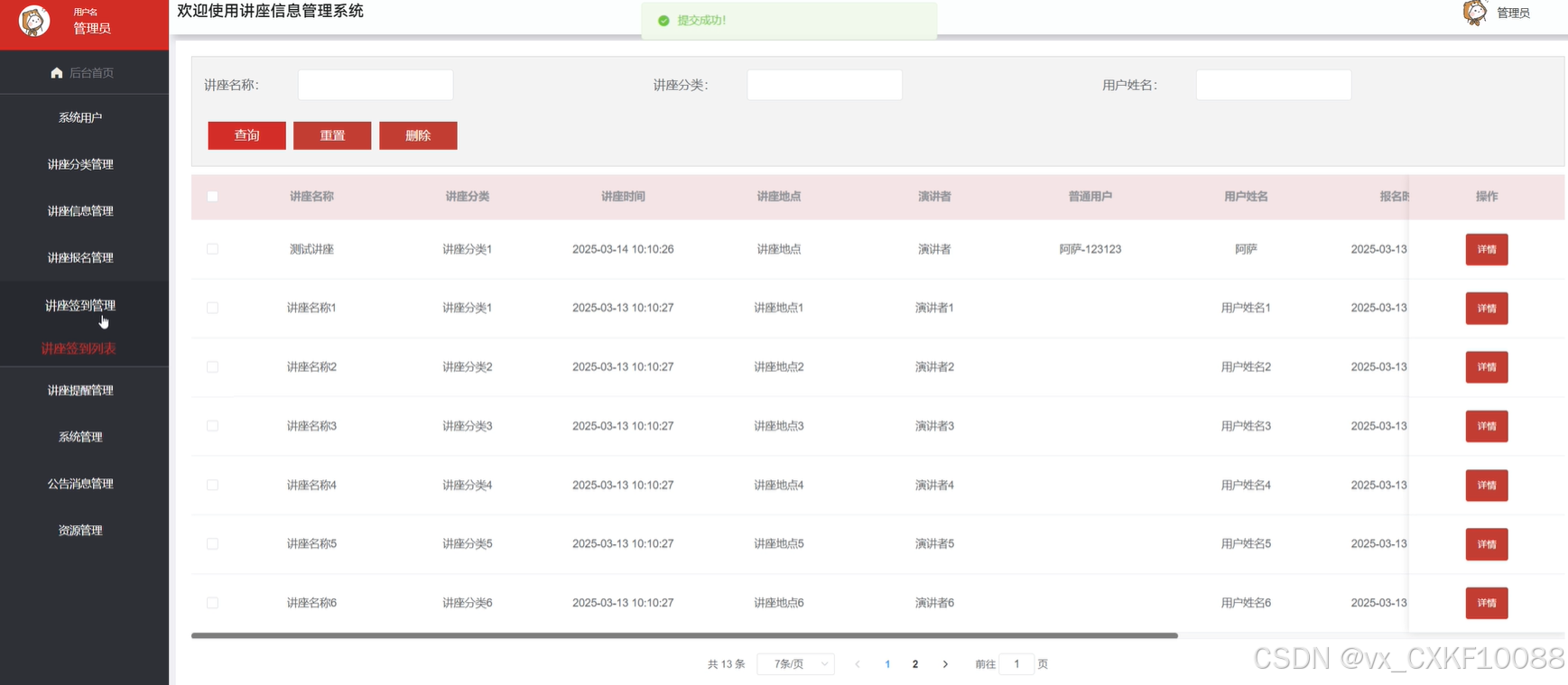 (4)讲座签到管理:管理员可查看所有用户讲座签到信息。可进行查询、重置、删除等操。