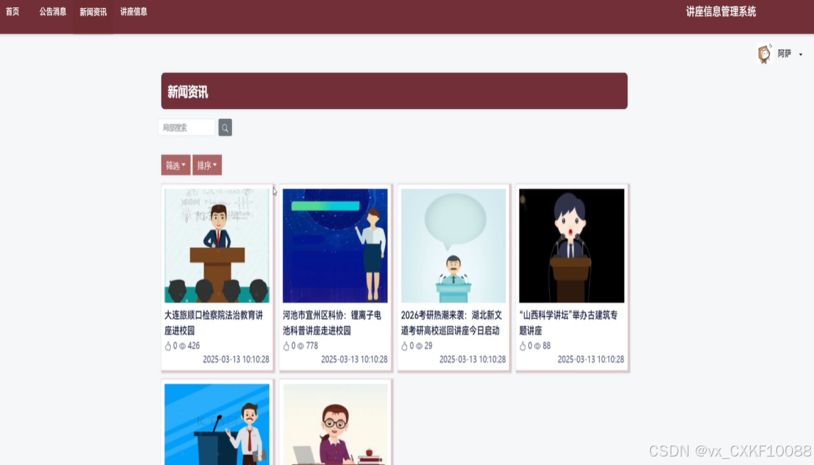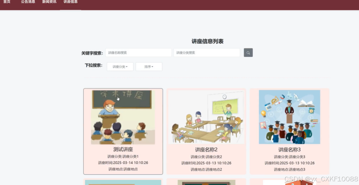 讲座信息:展示后台发布的讲座信息,可筛选搜索、局部搜索、下拉搜索,用户浏览到自己有喜欢的讲座可以报名参加,点击信息可发表评论、点赞、收藏等操作。讲座信息如图5-4所示。