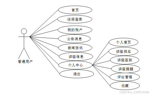 springboot讲座信息管理系统中普通用户包含注册、登录、首页、新闻资讯、公告消息、我的账户、讲座信息、个人中心等功能模块,对应角色用例图如图3.1所示: