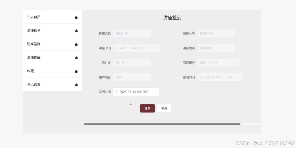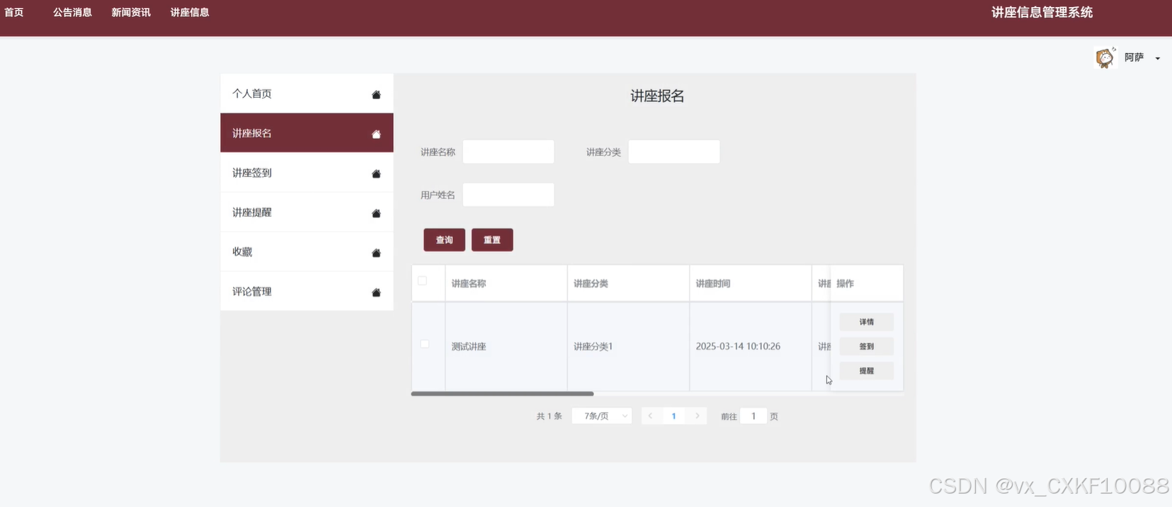 (7)个人中心:包含个人首页、、讲座报名、讲座签到、讲座提醒、评论管理、收藏等功能,讲座报名:普通用户可查看自己报名讲座的审核状态。可查询、重置等操作。讲座签到:用户参加讲座到场时进行一个签到,可查询、重置等操作。讲座提醒:用户报名参加讲座系统自动会有一个时间提醒,可查询、重置等操作。收藏:用户有自己喜欢的讲座信息可以收藏到自己的收藏夹,方便日后自己查看,并可点击详情进行点赞、收藏等操作。评论管理:可查看系统评论信息,可对信息进行评价,可查询、重置、删除等操作;