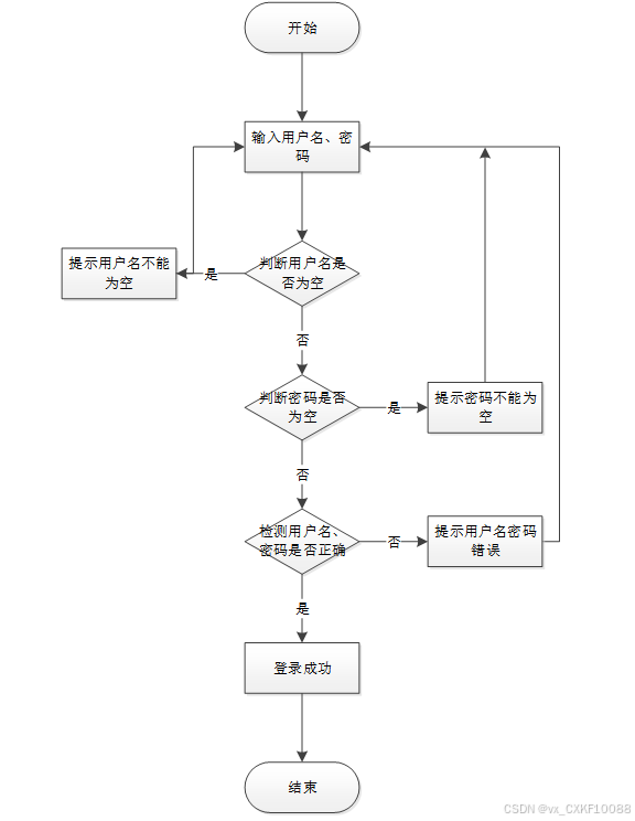 所有用户登录系统需要前端校验用户名、密码是否正确以及是否为空,具体流程图如图所示: