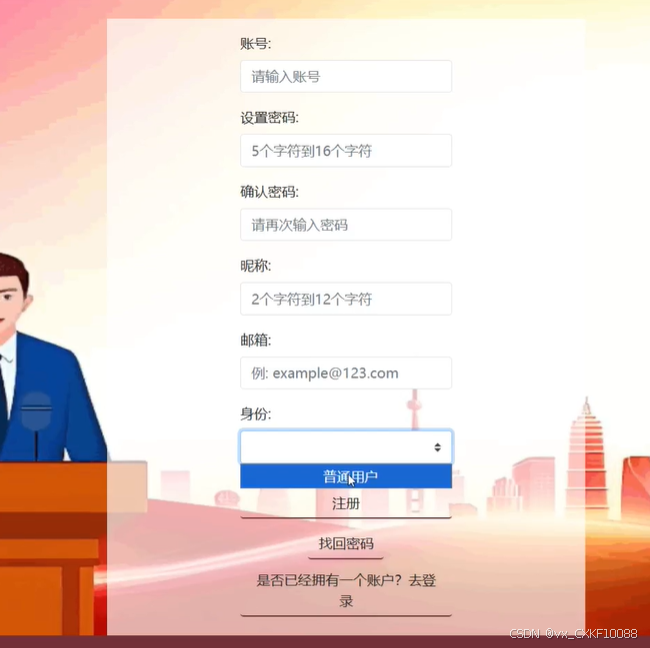 注册:在用户注册页面中填写好账号、设置密码、确认密码、昵称、邮箱、选择身份、用户姓名、用户性别、用户年龄、联系方式等信息,点击下方注册按钮,提示注册成功后,系统将自动跳转回到首页。普通用户注册如图5-1所示面图