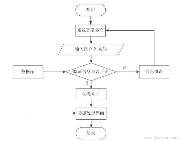 用户从“系统登录界面”开始,输入用户名和密码后,系统验证其信息是否正确。如果验证通过,则进入功能界面并进一步进入功能处理界面,最后流程结束;如果验证失败,则显示“信息错误”,用户需要重新输入。数据库支持验证过程。如图3-3所示。