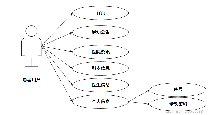 用户可查看住院信息,发起在线咨询,获取认知锻炼信息,查看取消挂号信息,管理收藏信息。用户用例图如图3-1所示。