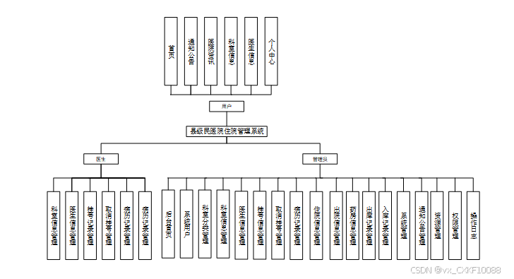 系统总体功能设计为县级民医院提供一个全面的住院管理平台,涵盖管理员、医生和患者三类用户的不同需求。管理员可以通过系统实现医院内部各项管理,包括科室管理、住院信息管理、挂号记录、病例管理、药房管理、住院与出院信息管理、资源配置、权限管理等,确保医院各项事务的高效、有序运行。同时,管理员还可以查看操作日志、发布通知公告,进一步提升管理透明度与协同效率。医生用户主要通过系统处理患者挂号、病历记录、住院及出院管理,实时更新患者的治疗进展与医疗安排,提高诊疗效率。患者用户则可以通过系统查询科室、住院信息、查看医院公告及资讯,管理个人账户,方便快捷地进行挂号、修改个人信息、查看病历等操作。系统通过不同角色的功能模块设计,有效整合医院的各项管理资源,提升医院运营效率、优化患者服务体验,并推动医院管理的数字化转型。