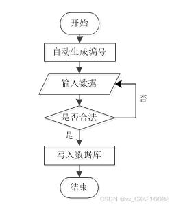 系统开始后自动生成编号,用户输入数据。系统判断输入的数据是否合法,若不合法则返回重新输入;若合法,则将数据写入数据库,最后结束流程。如图3-5所示。