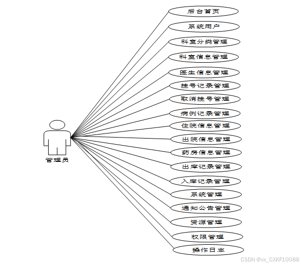 管理员可管理住院信息,处理在线咨询,管理认知锻炼信息,管理取消挂号信息,管理病历记录。管理员用例图如图3-2所示。
