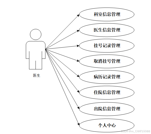 医生可管理病历记录,处理在线咨询,管理认知锻炼信息,管理取消挂号信息,维护自身信息。医生用例图如图3-2所示。