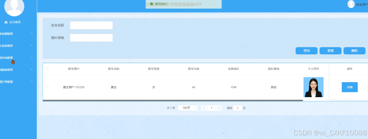 | 查看住院信息功能测试 | 1. 登录系统,进入住院信息页面。 2. 点击医生姓名,进入医生详情页面。 3. 查看医生的详细资料。 | 医生的详细资料(包括姓名、专业领域、从医时长等)正确显示。 | 与预期结果一致 |