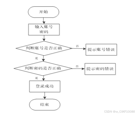 用户输入账号和密码后,系统首先判断账号是否正确,若不正确则提示“账号错误”;如果账号正确,则继续判断密码是否正确,若密码错误则提示“密码错误”;若账号和密码均正确,则显示“登录成功”,最后结束流程。如图3-4所示。