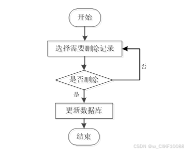 用户首先选择需要删除的记录,然后系统判断是否执行删除操作。如果用户选择不删除,则返回重新选择;如果选择删除,则更新数据库完成记录删除操作,最后结束流程。如图3-6所示。