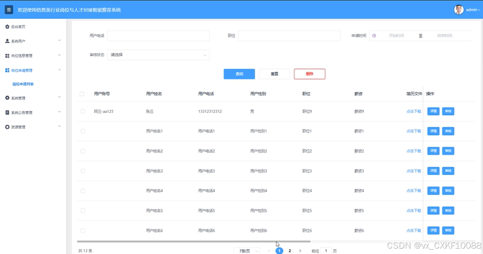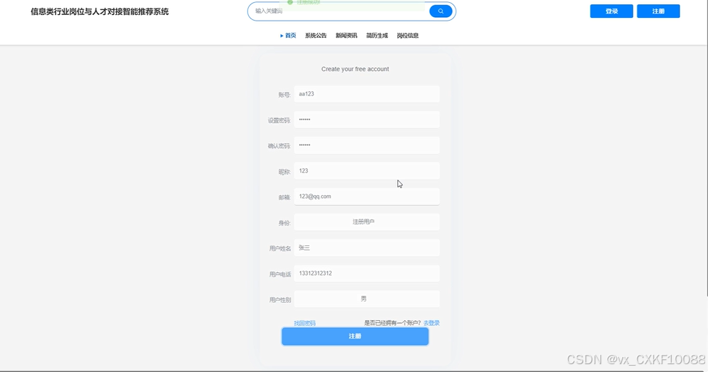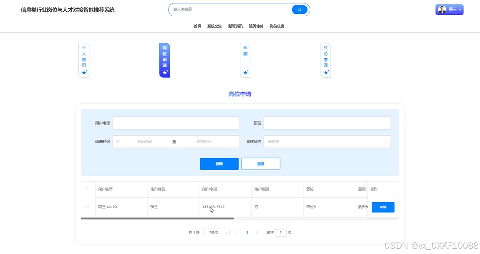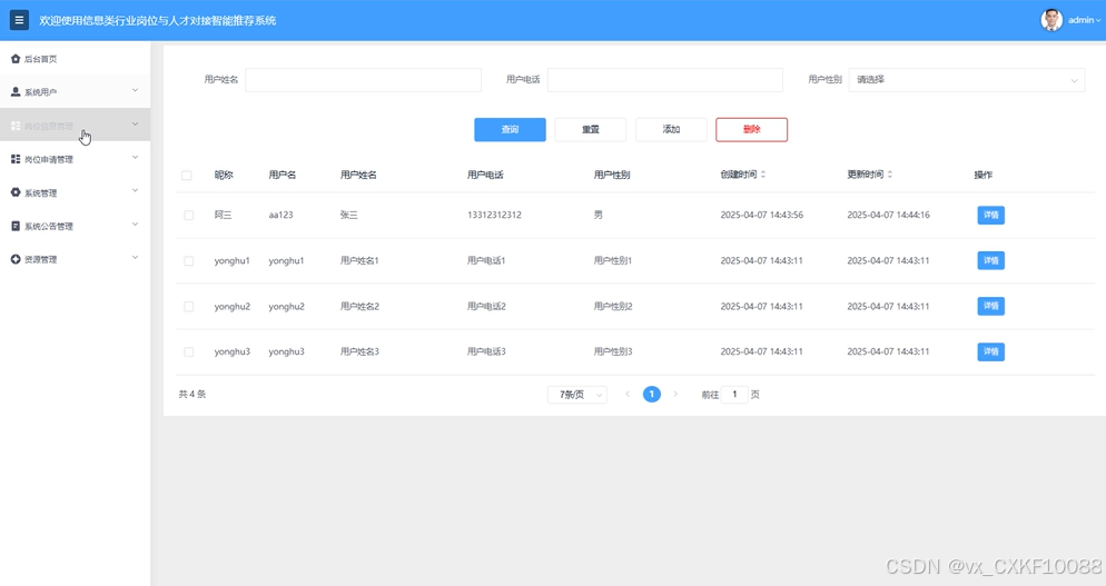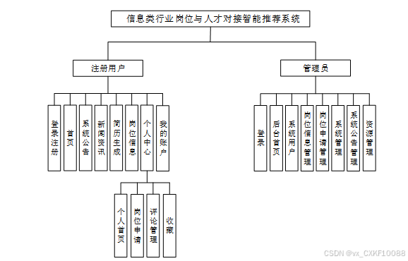 本系统旨在满足信息类行业岗位与人才对接的多样化运营需求,针对注册用户和管理员两大角色提供全面的功能支持。注注册用户可一键生成智能简历、浏览个性化岗位推荐并实时追踪申请进度,管理员则高效审核岗位信息、管理用户权限并通过数据看板优化系统运营策略。通过功能模块的精细化设计,系统实现了业务流程的自动化与智能化,为信息类行业岗位与人才对接的数字化智能推荐系统转型提供了技术支持。具体描述如下: