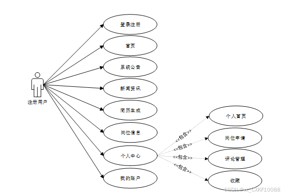 注册用户可借助智能简历生成工具快速创建标准化求职文档,通过个性化岗位推荐算法精准匹配心仪职位,实时追踪申请进度与反馈,同时享受技能评估、职业路径规划等增值服务,全面提升求职效率与成功率。注册用户角色用例图如下所示。