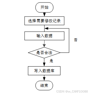 用户首先选择需要修改的记录,输入修改后的数据,系统判断输入数据是否合法。若数据不合法,提示重新输入;若数据合法,则将修改后的数据写入数据库,完成操作后流程结束。修改信息流程图如图3-4所示。
