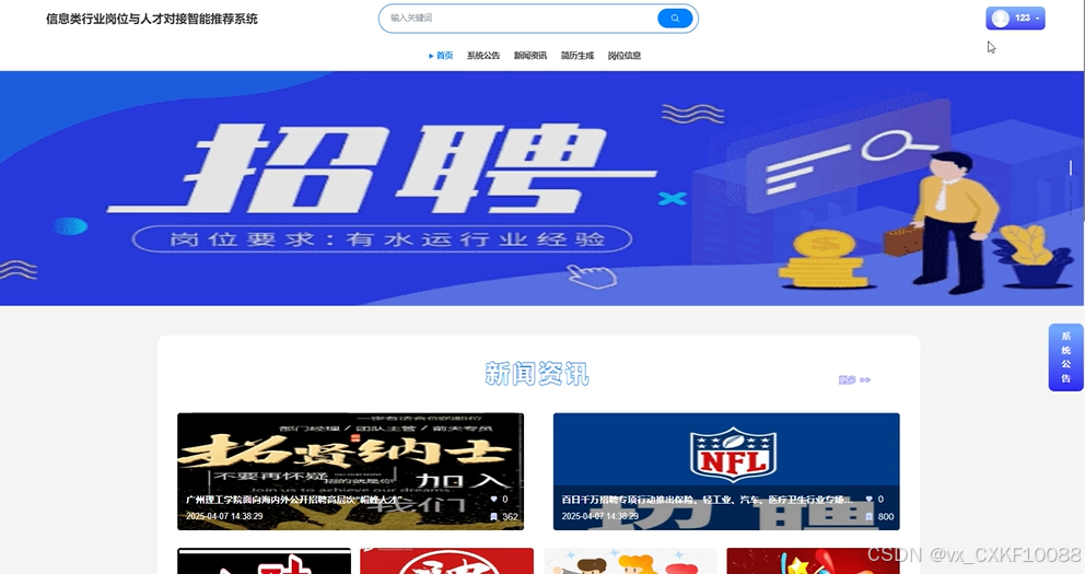 首页:展示个性化岗位推荐、热门资讯及系统公告,帮助用户快速获取关键信息。
