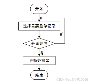 用户选择需要删除的记录后,系统判断是否确认删除。若未确认,返回选择环节;若确认删除,则更新数据库,删除对应记录,完成操作后流程结束。删除信息流程图如图3-5所示。