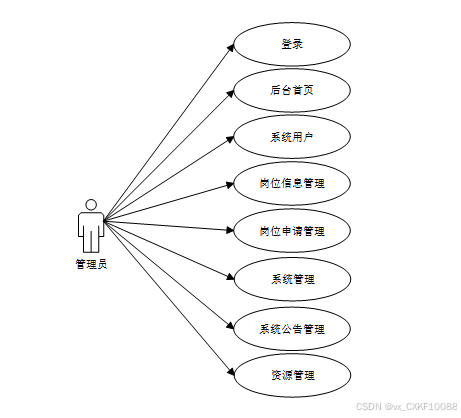 管理员通负责用户权限管理、内容审核与发布、数据监控分析,处理用户反馈,配置系统参数,维护平台安全与稳定运行,保障整体服务质量。管理员角色用例图如下所示。