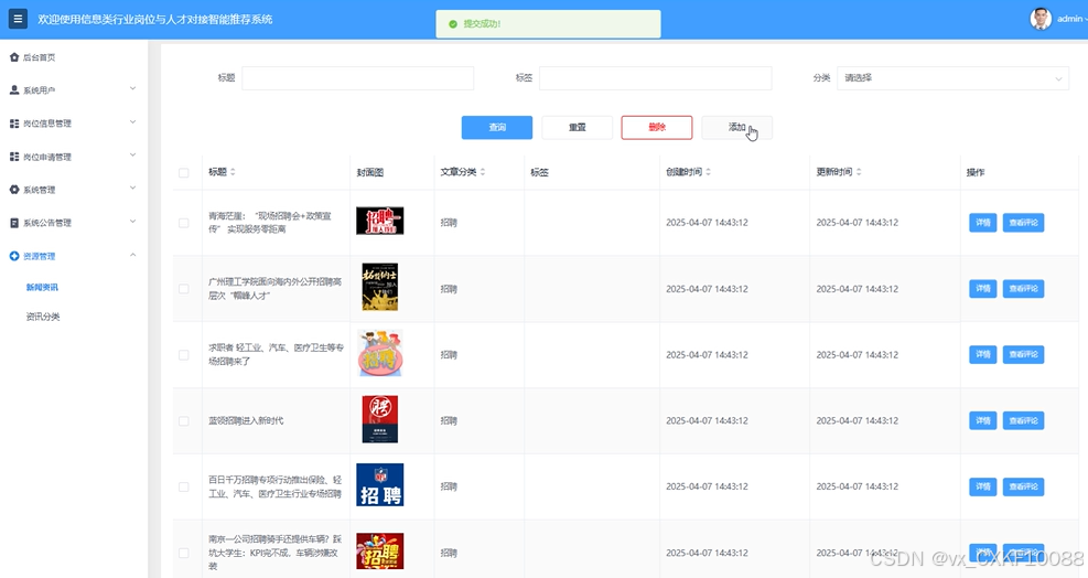In terms of core functions, the system constructs dynamic profiles by analyzing user behaviors such as resume browsing, job favorites, and application records. It uses natural language processing technology to parse skill keywords like Python and machine learning from job JDs, and employs collaborative filtering and semantic matching algorithms to achieve two-way job-person recommendations with an accuracy rate exceeding 85%. For registered users, the system offers personalized job recommendations, intelligent resume generation, multi-dimensional screening, and application progress tracking. On the admin side, it supports job authenticity verification, user behavior analysis, system data dashboards, and resource permission management, providing visual reports to assist operational decision-making.
