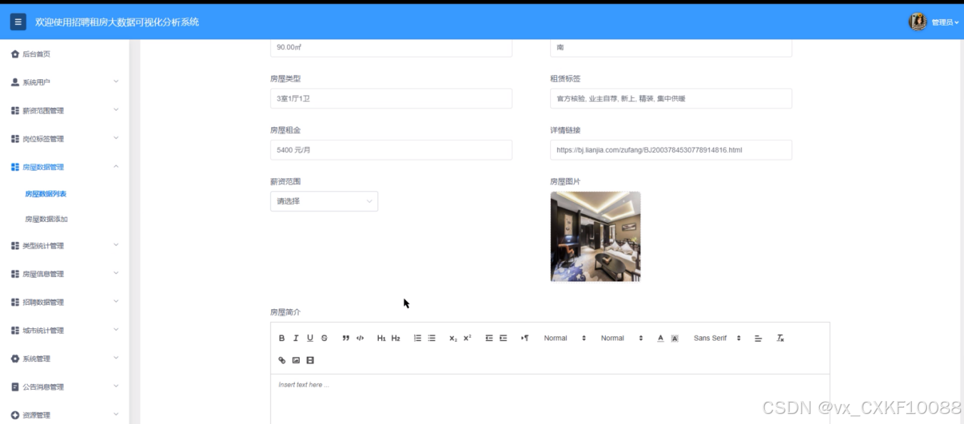 房屋数据管理:管理员可以批量下载和导入文档来管理房屋数据,添加新的房屋类型,以及添加展示信息,包括上传房屋图片、选择薪资范围和输入房屋简介,确保信息的准确性和完整性。