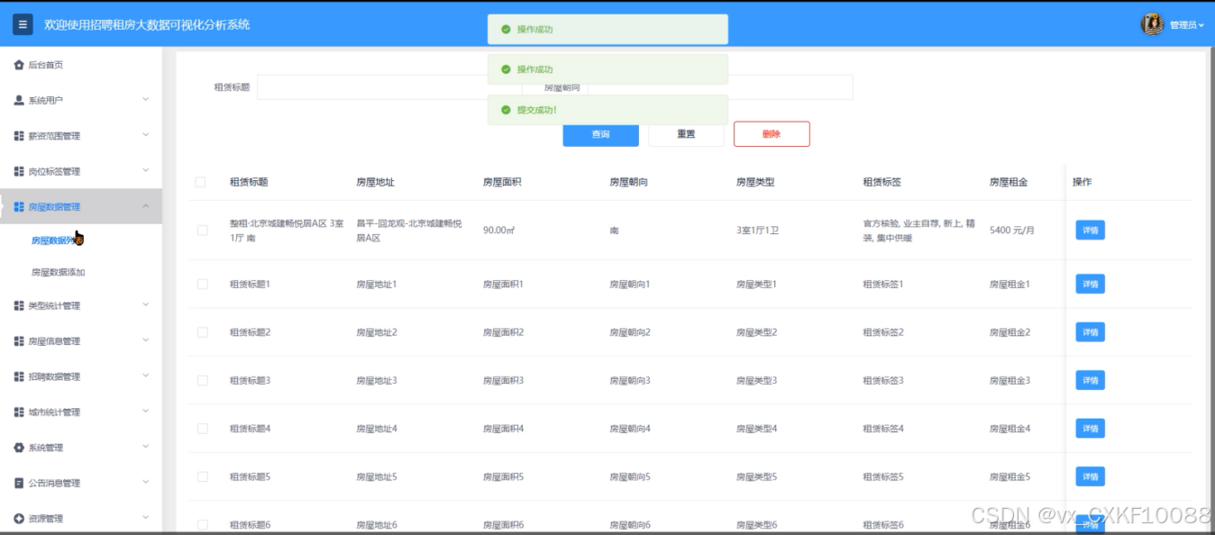 This system is developed using the Django framework and Python language, and the backend uses MySQL database for data storage and management. The system includes multiple functional modules: statistical charts for housing data, type statistics, recruitment data, user management, salary range management, job label management, housing data management, type statistics management, housing information management, recruitment data management, city statistics management, etc. These modules can efficiently integrate and display core data in the rental and recruitment fields, improve the system's operational convenience, and provide users with accurate data analysis and visual display.