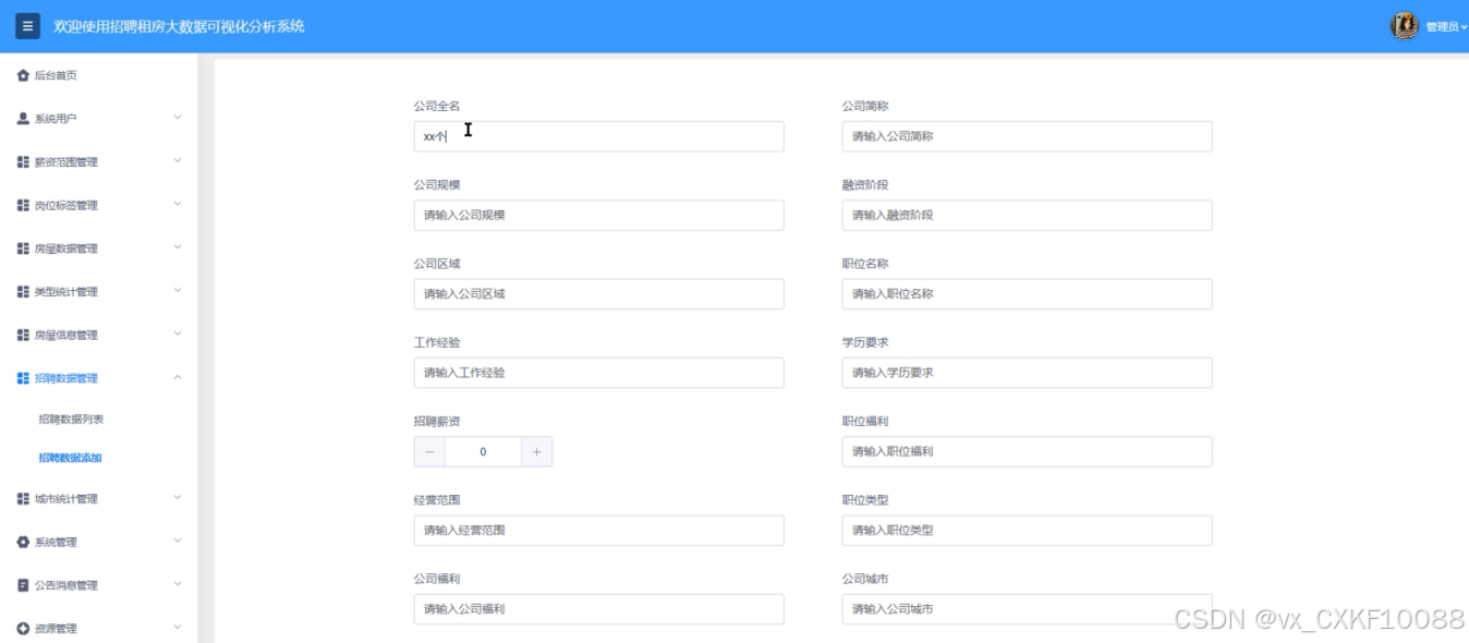 招聘数据管理:管理员可以进行招聘数据的查询、重置、删除和添加操作,录入公司的详细信息,如公司全称、简称、规模、区域、融资阶段、招聘薪资、经营范围、公司福利等,以及录入城市统计信息。