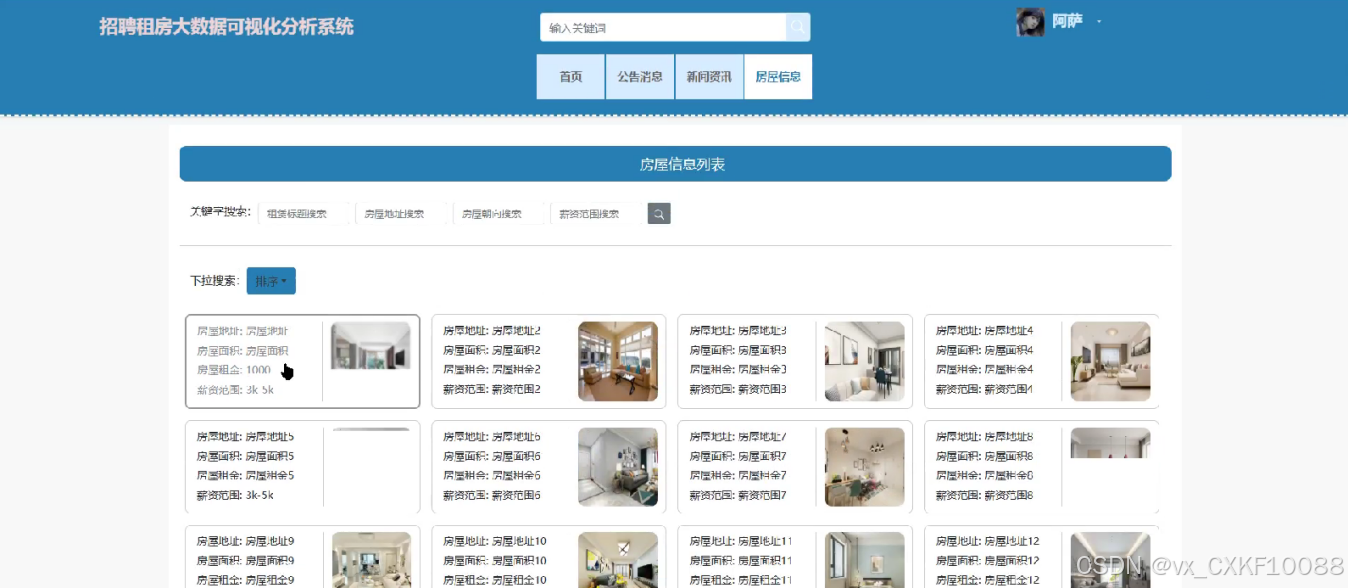 房屋信息:系统会根据用户注册时选择的薪资范围和岗位标签推荐相应的房屋信息。用户可以使用关键字搜索功能,快速找到自己感兴趣的房源。搜索结果会显示房屋的地址、面积、租金等详细信息,并提供详情链接。点击详情链接可以查看房屋的详细描述、图片和联系方式,帮助用户做出更明智的租赁决策。