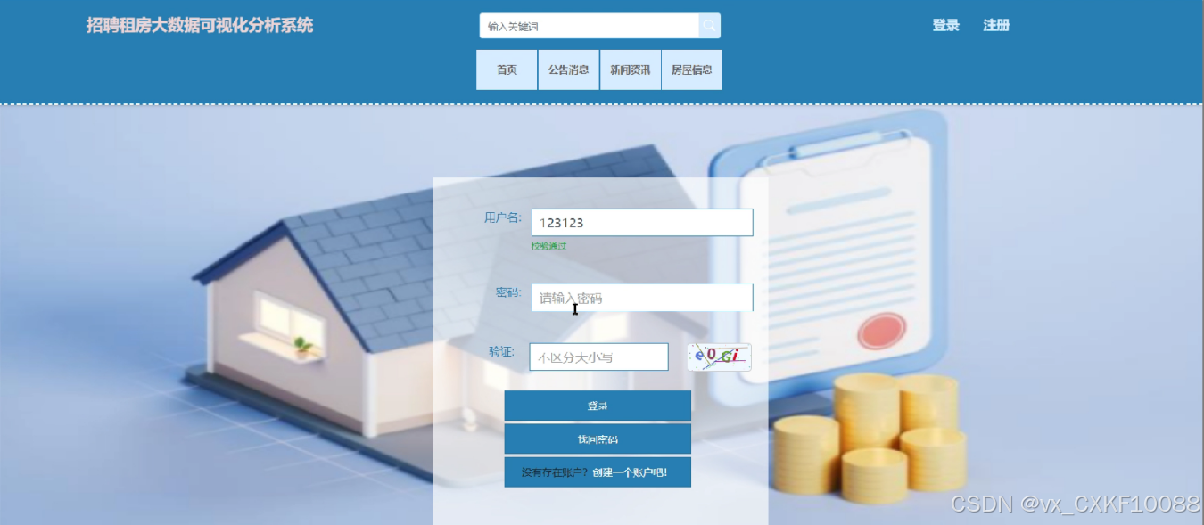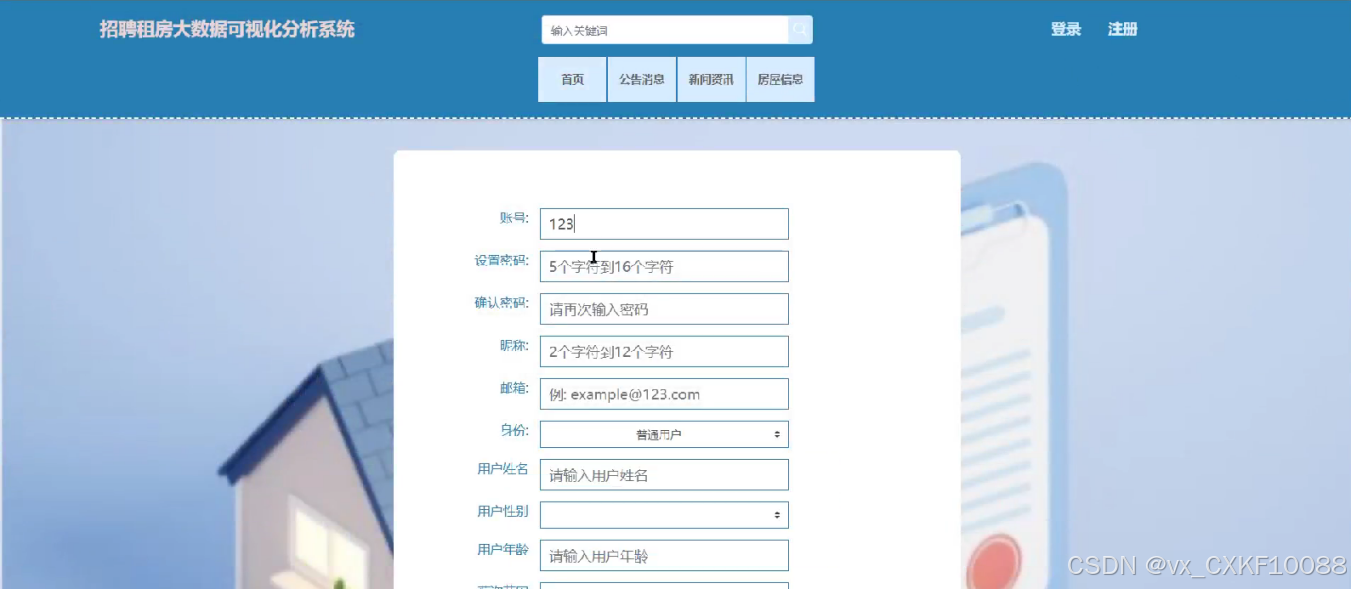 首页:用户在首页可以查看最新的公告消息和新闻资讯,这些内容会根据用户注册时选择的薪资范围和岗位标签进行个性化推荐。此外,首页还会展示系统推荐的房屋信息,帮助用户快速找到合适的居住环境。