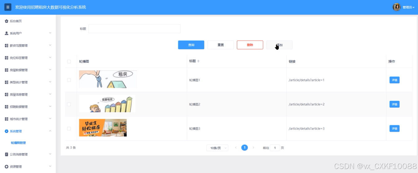 系统管理:管理员可以添加、编辑或删除轮播图内容。轮播图通常用于展示重要通知或促销信息,管理员通过管理轮播图可以有效吸引用户关注。