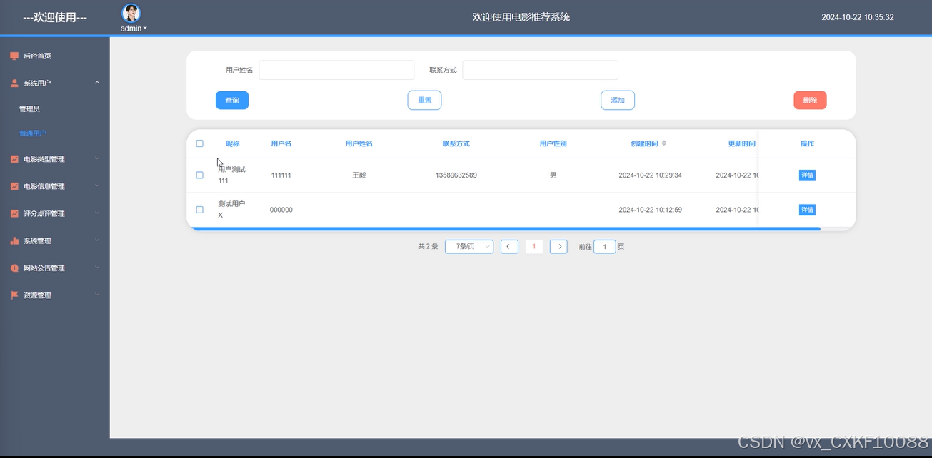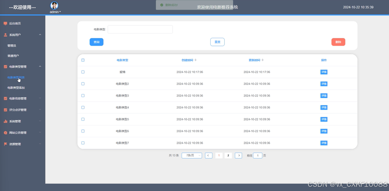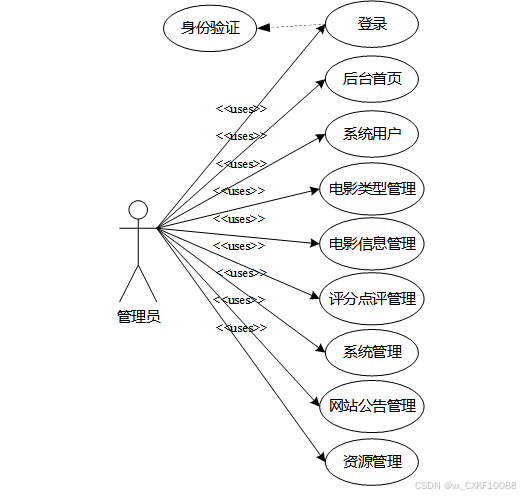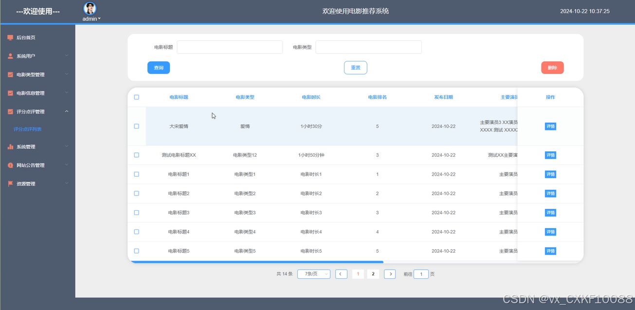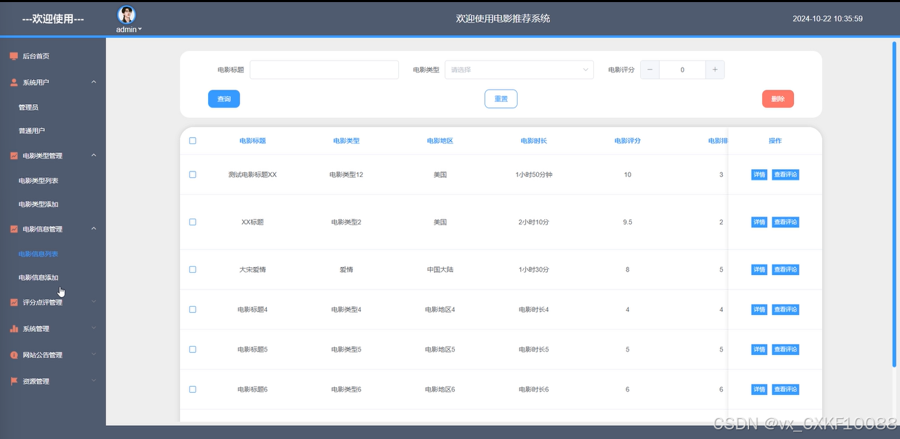 后台管理端:管理员可登录系统后台进行管理,拥有后台首页、系统用户、电影类型管理、电影信息管理、评分点评管理、系统管理、网站公告管理、资源管理等功能。