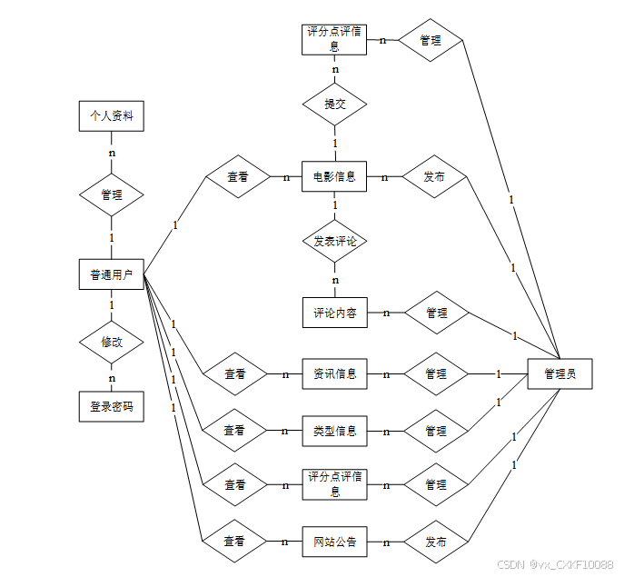 普通用户功能模块包括首页展示网站公告、轮播图、推荐电影信息等。在“电影信息”模块中,用户可以查看电影详情、进行点赞、收藏、评论和评分,并通过电影标题、评分进行搜索。此外,电影资讯模块提供了影评和推荐文章,用户可进行互动操作。个人中心模块让用户管理个人信息,如修改头像、昵称、密码,以及管理收藏和评分点评记录,提升个性化体验。