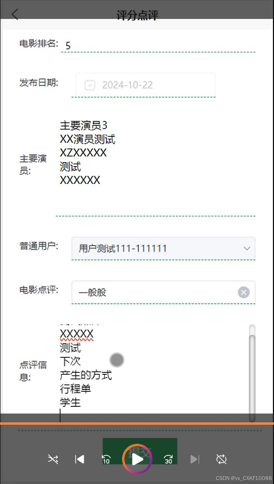 | 评分点评 | 电影信息点评内容:用户评分点评 | 在电影信息列表中显示评分点评内容,在个人中心列表里显示评分点评内容详情 | 和预期一致 |