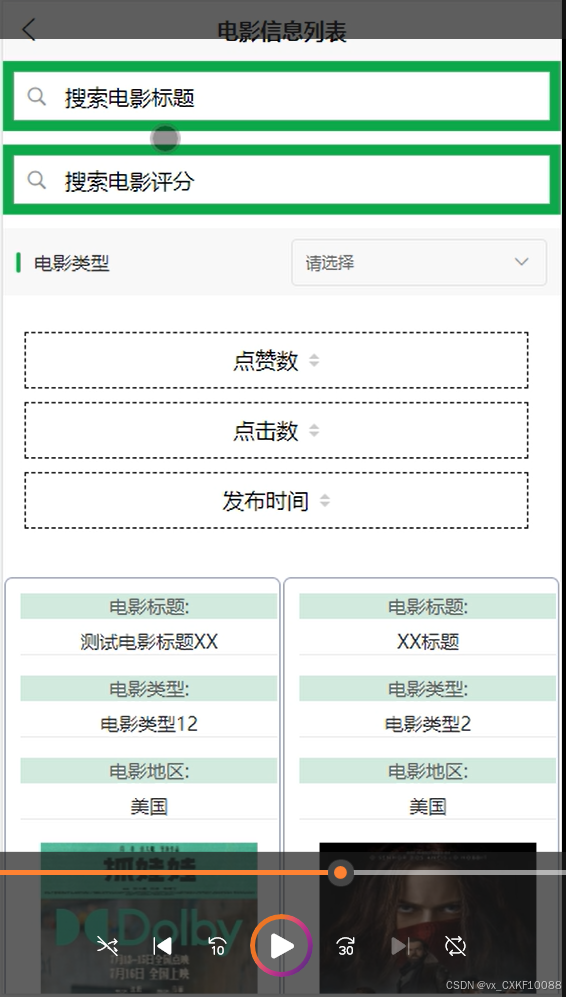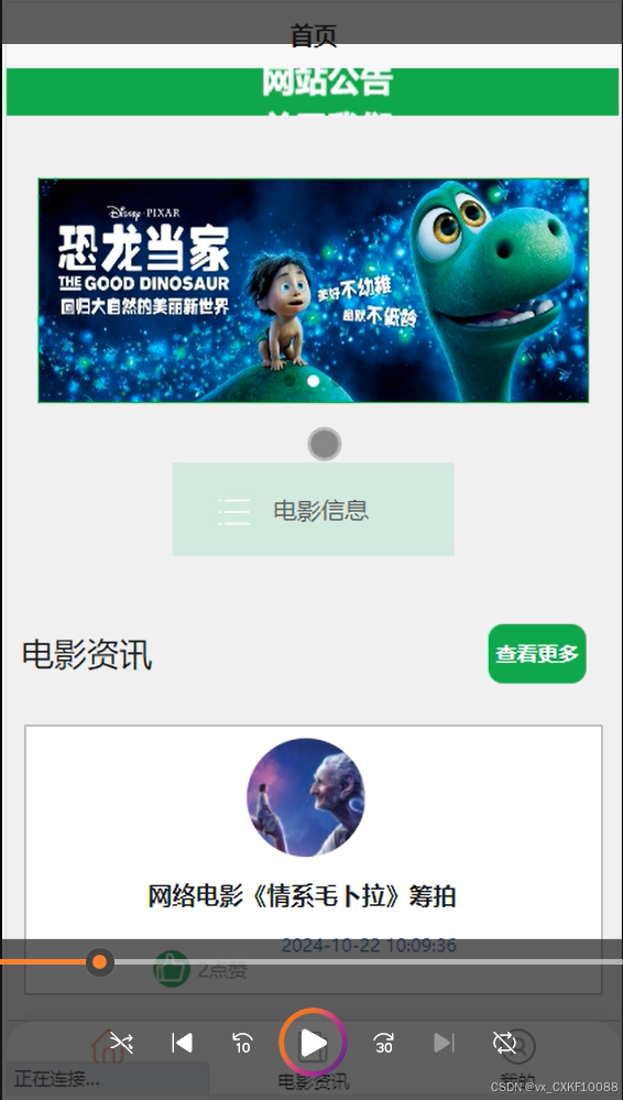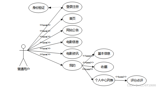 普通用户端:系统前台普通用户主要包括登录注册、首页、网站公告、轮播图 、电影信息、电影资讯、我的(基本信息、收藏、个人中心列表、评分点评)等功能。
