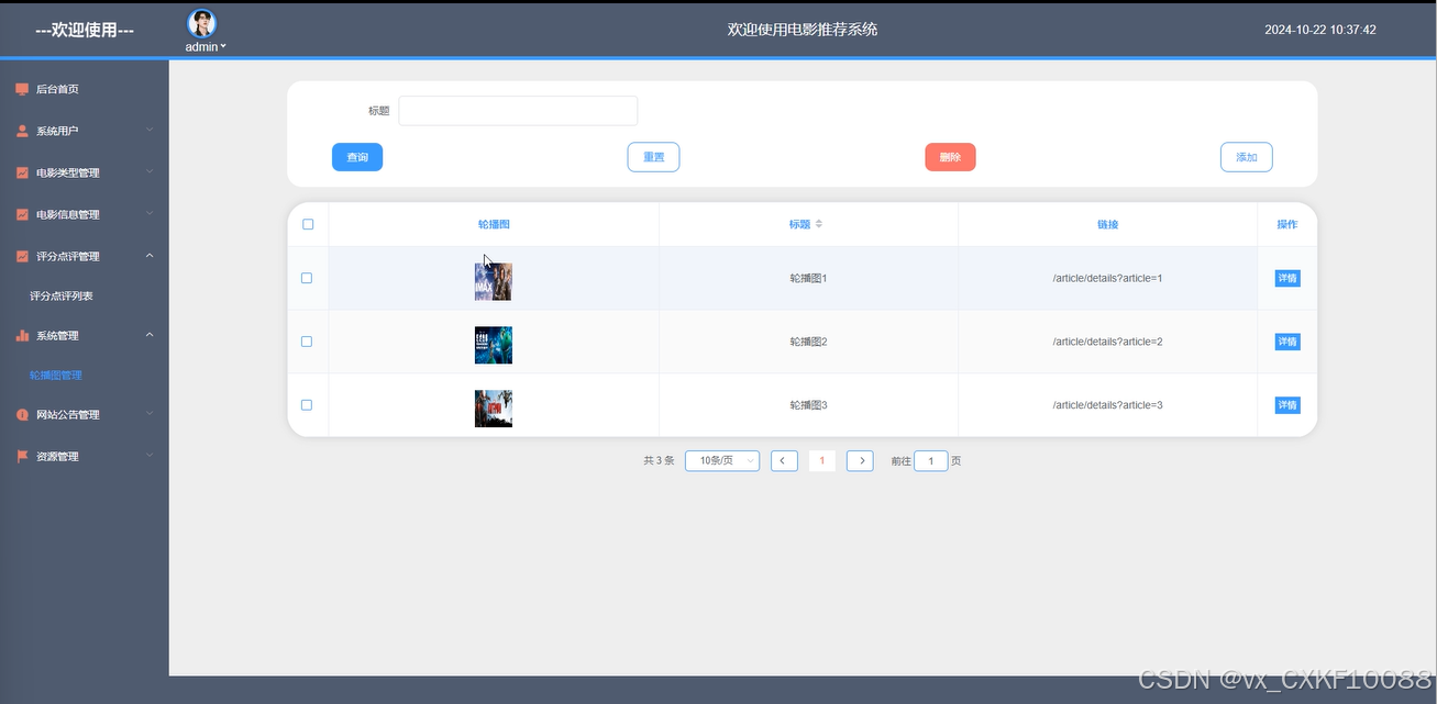 在系统管理模块中,管理员主要负责轮播图的管理。管理员可以查看每张轮播图的详细信息,包括图片内容、标题以及对应的链接等。为了快速找到特定轮播图,管理员可以通过输入标题进行搜索。此外,管理员还具备对轮播图进行增删改查的能力,以优化系统的展示效果和用户体验。系统管理页面设计如下图所示。