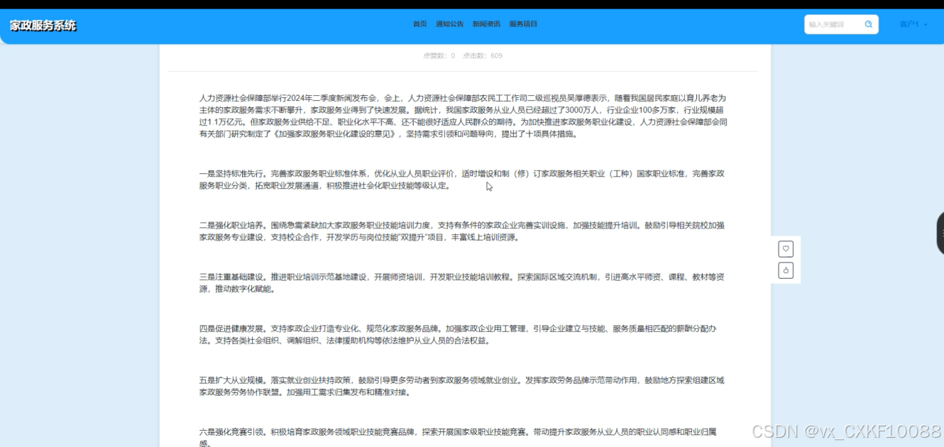 - 新闻资讯:新闻资讯模块展示与家政服务相关的行业新闻或平台资讯,帮助用户了解家政行业的最新动态和相关政策。用户可以分类浏览不同类型的资讯,获取有用的信息资源。