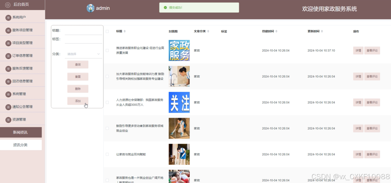 - 资源管理(新闻资讯与资讯分类):新闻资讯:管理员可发布与家政行业相关的资讯或平台动态,为用户提供有价值的内容。资讯分类管理:对资讯进行分类整理,方便用户按主题浏览,提高信息的可读性和用户体验。