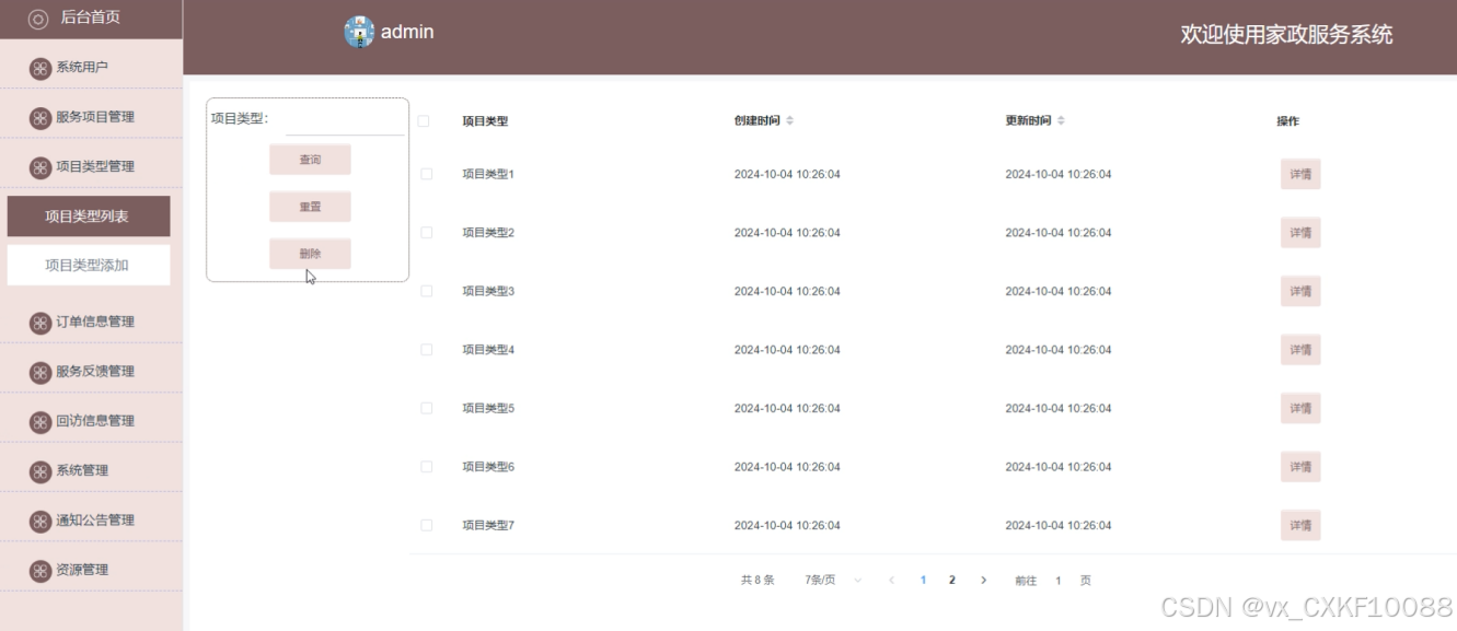 - 项目类型管理:管理员可以对服务项目进行分类管理,维护项目类型的名称和描述,确保服务项目的清晰层级。合理的分类便于客户快速找到所需服务,提高用户体验。
