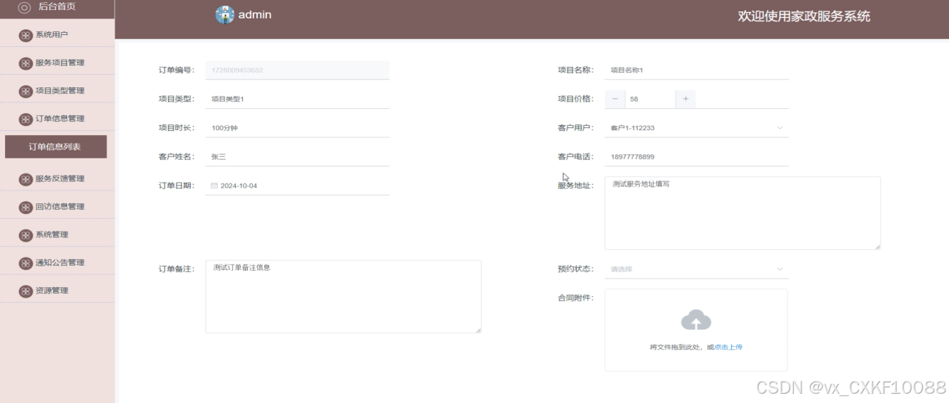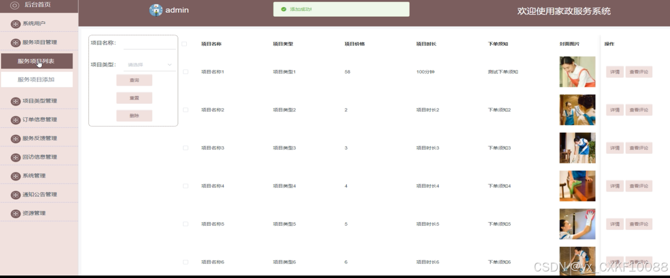 - 服务项目管理:服务管理:该模块允许管理员增删改查家政服务项目,并维护服务的描述、价格、工作时长等信息,确保项目清晰准确。