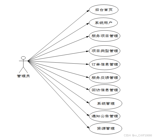 管理员具备后台首页、系统用户、服务项目管理、项目类型管理、订单信息管理、服务反馈管理、回访信息管理、系统管理、通知公告管理、资源管理等需求用例。详细用例图如图3-3所示。