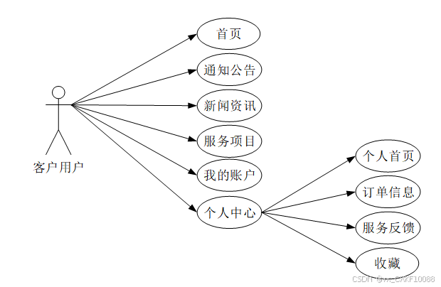 客户用户具备首页、通知公告、新闻资讯、服务项目、我的账户、个人中心(个人首页、订单信息、服务反馈、收藏)等需求用例。详细用例图如图3-1所示。