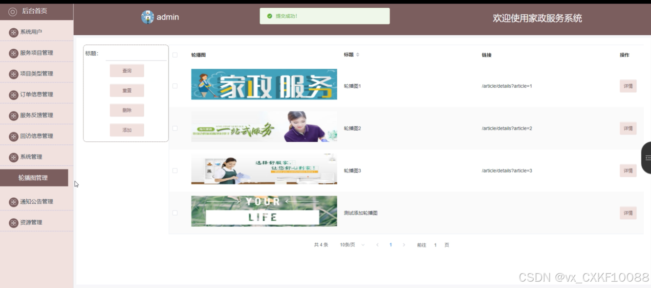 可以查看轮播图详情,以及查询、重置、删除、添加等操作。如图5-13所示。