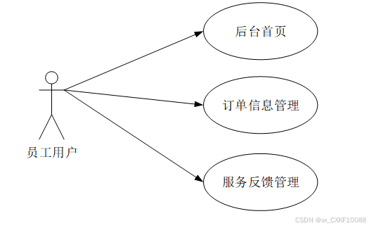 员工用户具备后台首页、订单信息管理、服务反馈管理等需求用例。详细用例图如图3-2所示。