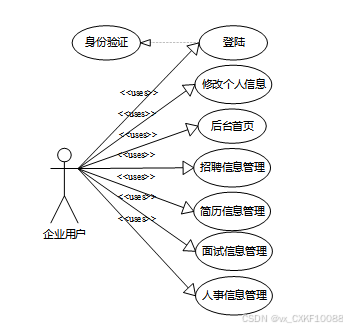 企业用户是系统的重要使用群体,其主要使用场景包括发布招聘信息,根据岗位需求创建并管理职位;筛选简历,通过条件筛选快速找到符合要求的候选人;安排面试,制定计划并通知候选人;发送录用通知,及时告知录用结果;以及管理招聘进度,实时跟踪招聘过程。通过这些功能,系统能够帮助企业优化招聘流程,提升效率和资源利用率,满足企业高效招聘的需求。详细用例图如图3.2所示。