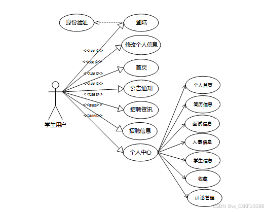 大学校园招聘信息管理系统用例分析主要从学生用户、企业用户、教师用户、管理员这些实体展开描述。