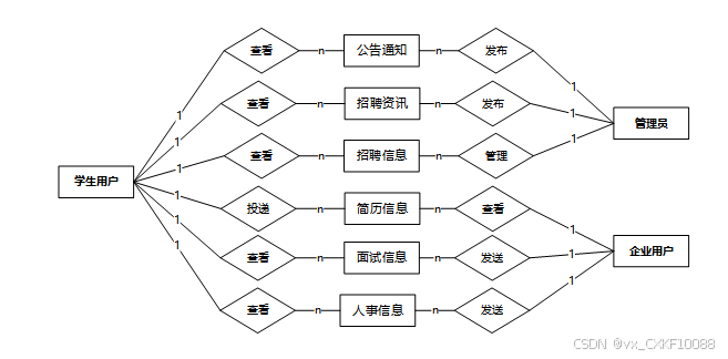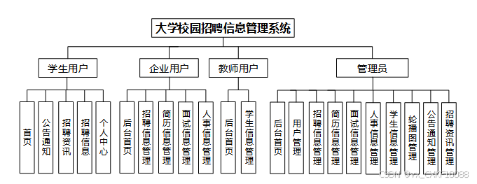 (3)功能设计:系统功能模块涵盖学生管理(信息查询、简历投递、面试管理)、企业管理(招聘信息发布、简历筛选、面试安排)、教师管理(就业统计、数据分析)及管理员管理(权限管理、信息审核、公告发布)。