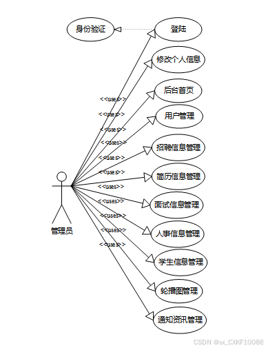 管理员用户是系统的核心管理角色,其主要使用场景包括维护系统运行,管理用户权限,确保系统数据的安全性和稳定性;监控平台使用情况,及时处理异常;审核并发布招聘信息,保证信息的真实性与合规性,为优化系统功能和提升服务质量提供决策支持。通过这些功能,管理员有效保障了系统的高效运行和用户体验。详细用例图如图3.3所示。