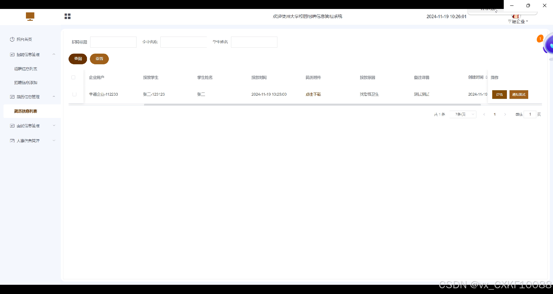 - 简历信息管理:查看并筛选学生投递的简历,对简历进行标记(如待联系、已面试等),支持导出或批量操作。