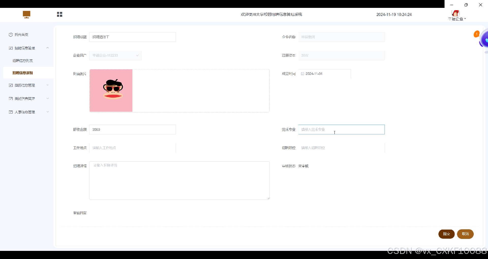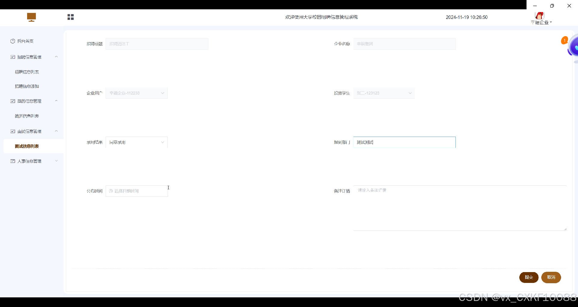 - 招聘信息管理:发布和管理招聘信息,包括岗位描述、薪资待遇及招聘截止时间,支持信息更新和下架操作。