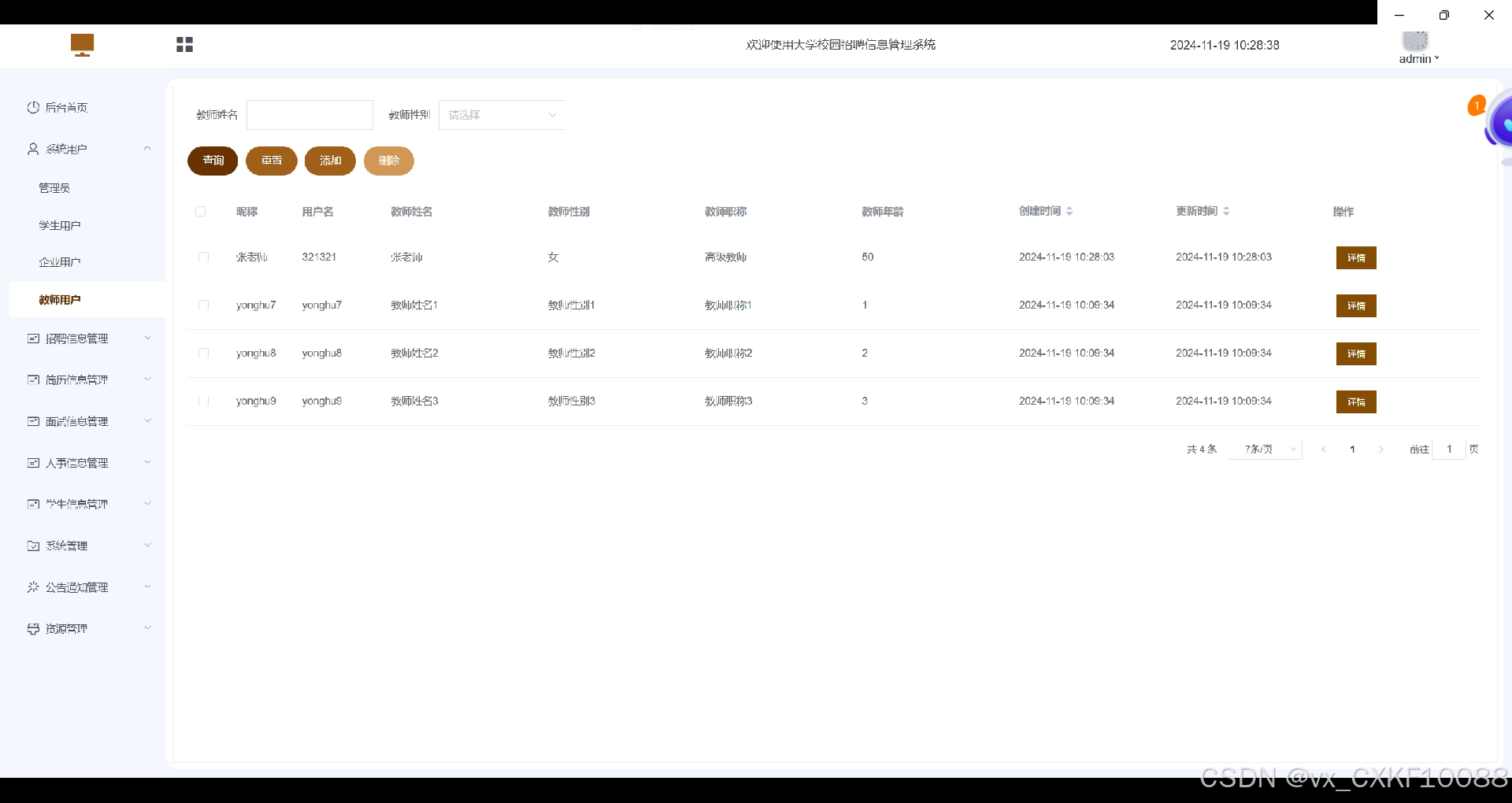 - 系统用户管理:审核并管理学生、企业、教师和管理员账户,支持权限分配和异常账户处理。