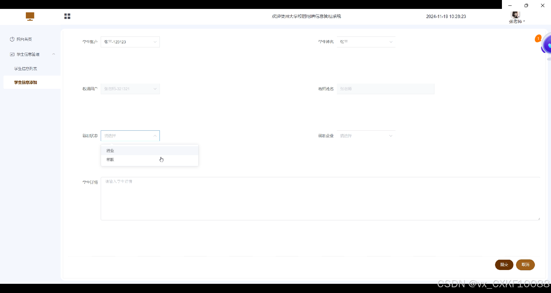- 学生信息管理:管理学生的就业信息,记录投递岗位、录用情况及就业状态,并支持添加、修改或批量导出学生就业记录。